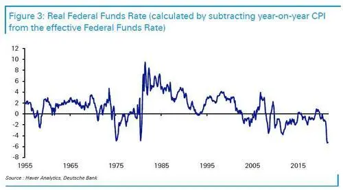 德意志銀行表示這使聯準會落入一個兩難境地:通脹率持續飆升至高位,失業率也在節節攀升。 如果為了應對通脹而提高利率可能會加劇失業狀況。 由於石油危機,美國實際聯邦基準利率已經下降到負數水準。 值得一提的是,目前的實際利率比70年代的任何時期都要低。