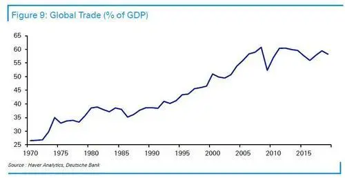 70年代全球化進一步擴大,全球貿易佔GDP的比例從1970年的27%上升到1980年的39%。 但自2008年以來,全球化陷入了停滯。