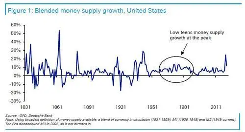 70年代開始的通貨膨脹由於美元與黃金脫鉤而惡化。 鑒於當時幾乎所有其他貨幣都與美元挂鉤,世界很快就從以黃金為基礎,轉向了由法定貨幣控制。 有趣的是,隨著政策限制的放鬆,貨幣總量的年增長率從上世紀60年代末的個位數持續增加到兩位數。