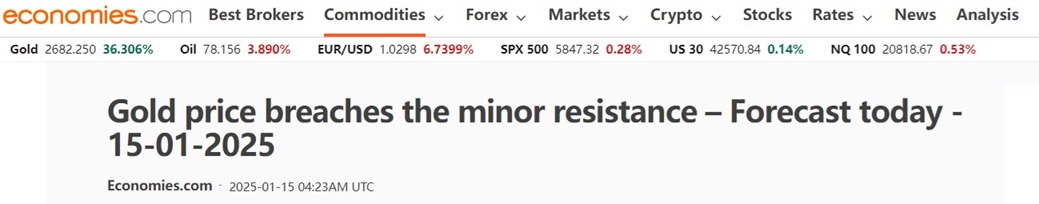 周三(1月15日)亞市尾盤,現貨黃金維持日内反彈走勢,目前金價位于2681美元/盎司附近。知名财經資訊網站Economies.com周三最新撰文,對日内黃金技術前景進行分析。