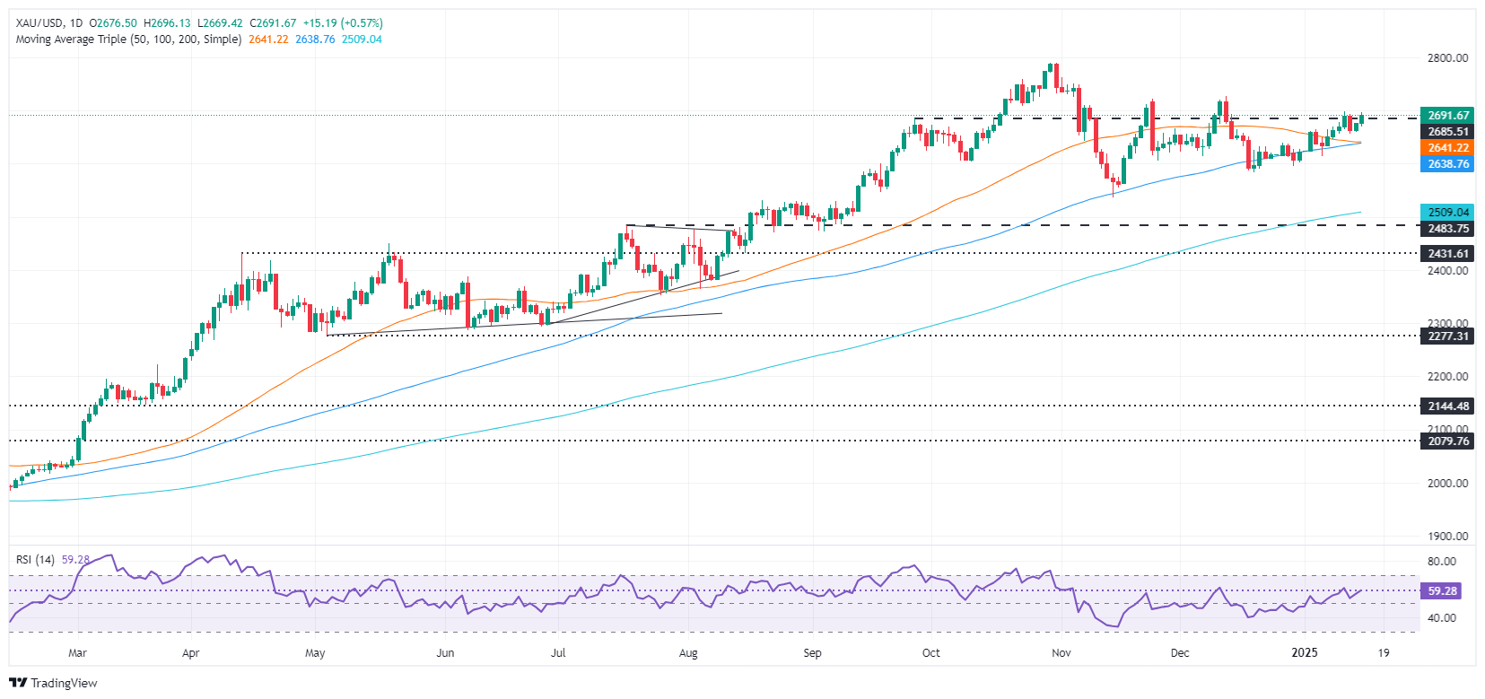 現貨黃金周三收盤大漲19.20美元,漲幅0.72%,報2696.18美元/盎司。