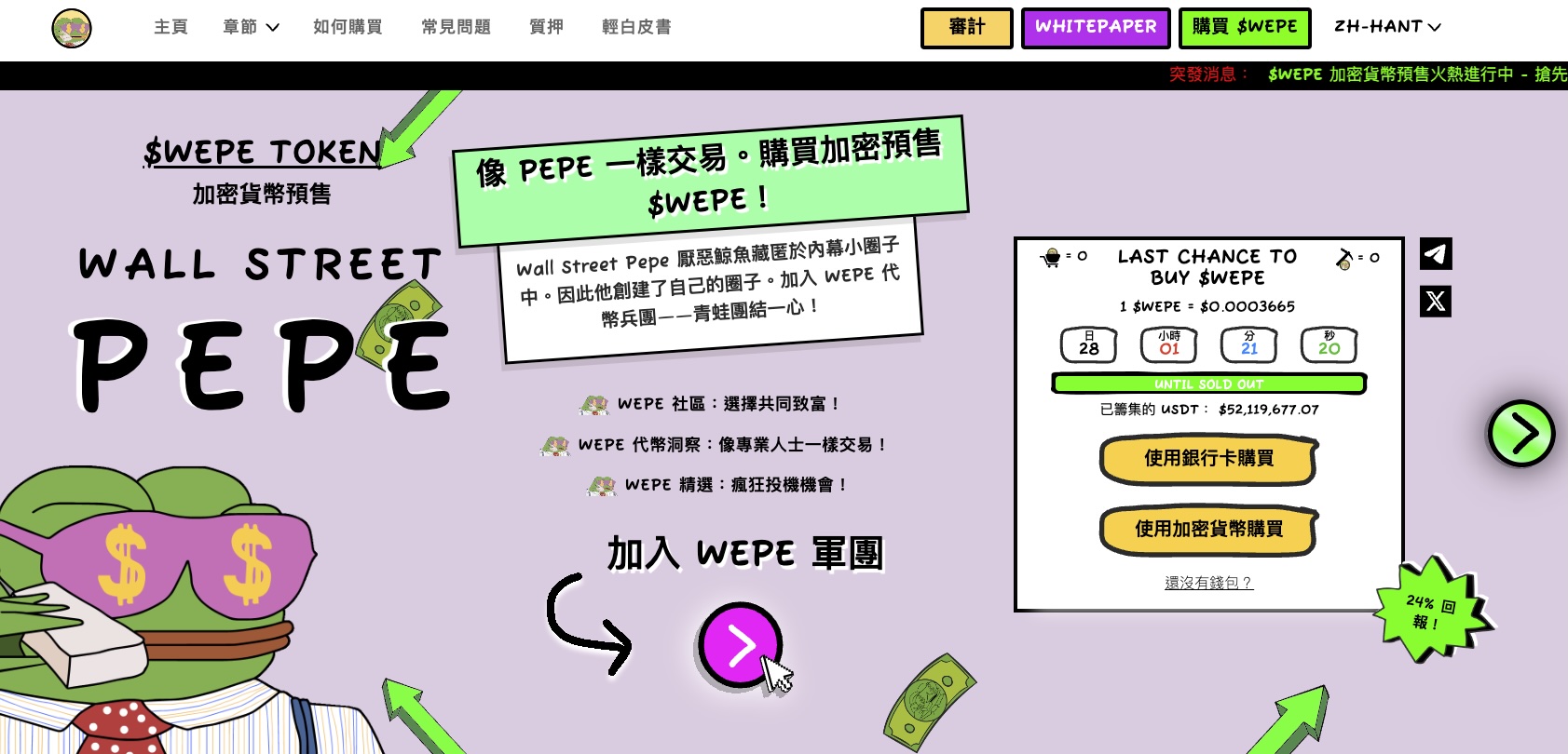 要留意,$WEPE仍在預售階段,在預售結束後再上市DEX及CEX,建議投資者可進入官方網站、X及Telegram瞭解預售最新資訊。