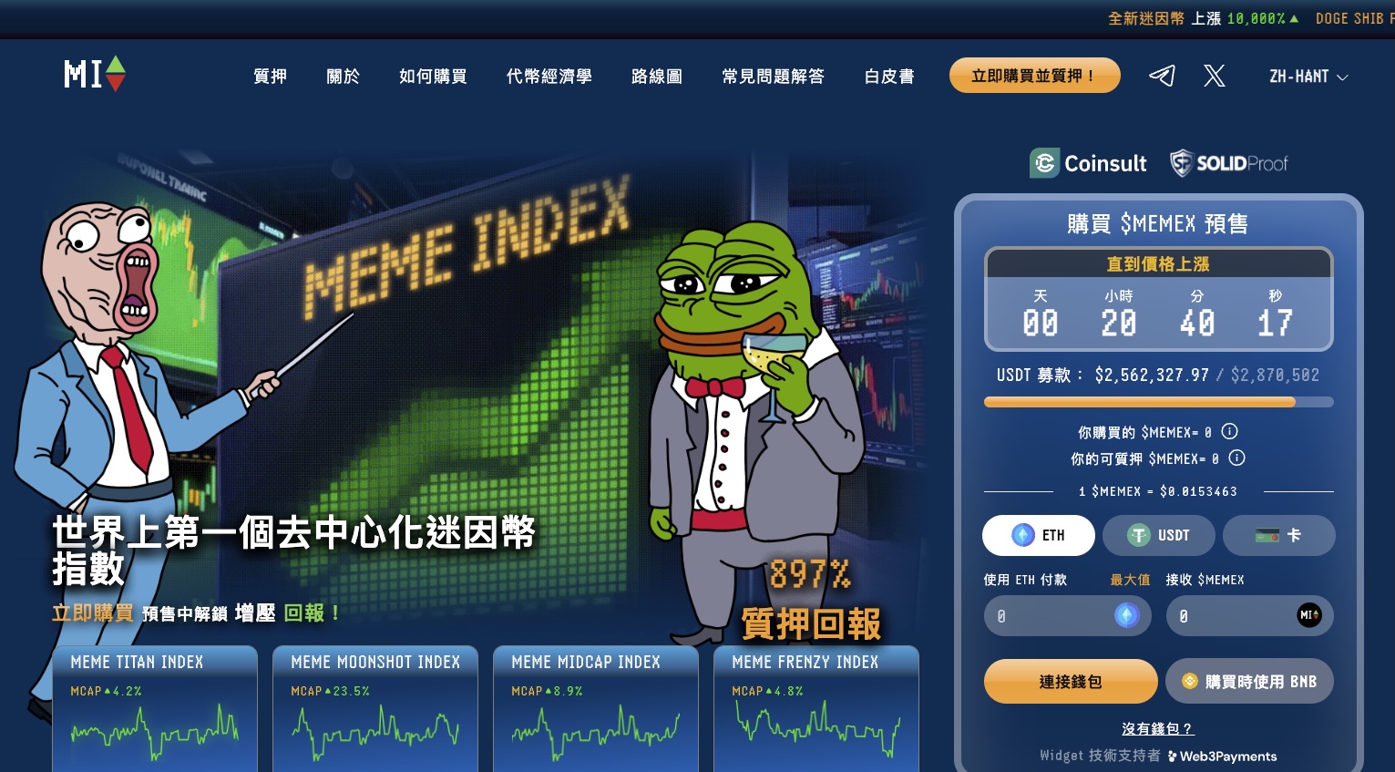 此外,為了保障投資者安全,Meme Index 已通過 Coinsult 和 SOLIDProof 智慧合約審計,進一步增強了市場信任度。目前,$MEMEX 預售正在火熱進行中,投資者可以通過官方網站參與,使用 $USDT、$ETH 或 $BNB 購買代幣。
