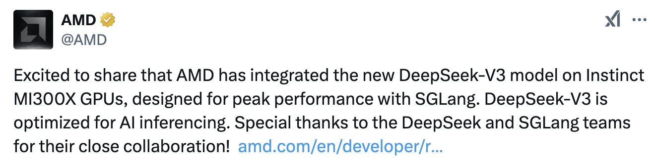 AMD(AMD-US) 週五 (24 日) 通過其官方 X 平台宣布,已將全新的 DeepSeek-V3 車型整合至其 Instinct MI300X GPU。這一消息強調了 AMD 在人工智能 (AI) 領域的持續發展與投入。 DeepSeek-V3 模式是專為 AI 推論 (inference) 優化的,此舉可望提升 AMD GPU 在 AI 應用方面的效能。
