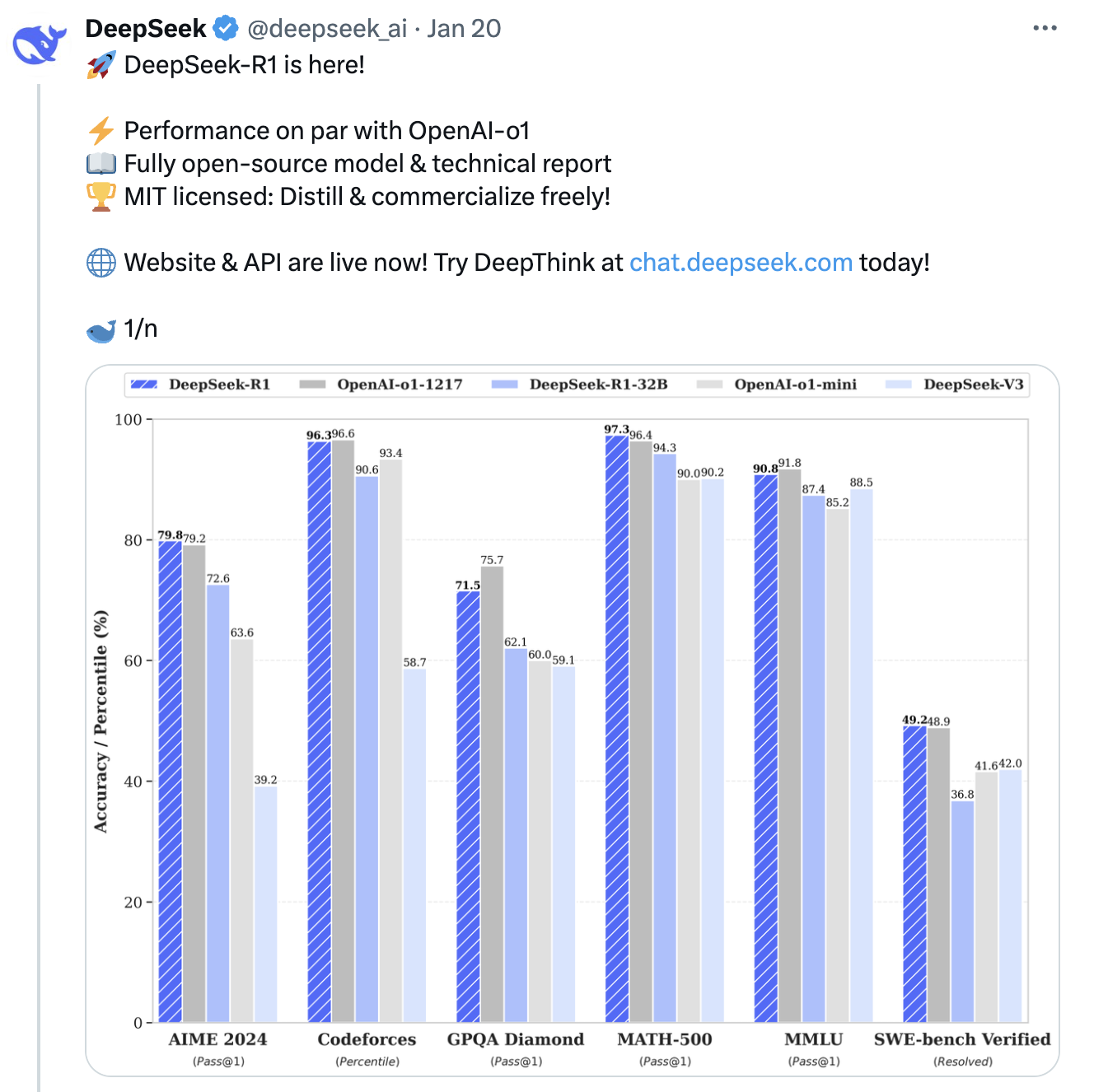 而造成一眾AI概念的股票與加密貨幣下行的原因是,投資者認為作為新一代更具經濟性的LLM(大型語言模型),花費低成本訓練出成媲美ChatGPT o1的能力,令市場質疑巨頭們在AI產品未帶來盈利的情況下大灑金錢是否「灑了下海」。而低算力的情況下也能訓練出高品質的大模型,令科技巨頭的資金優勢削弱,市場可能出現新的競爭者。歸根究柢,這次DeepSeek帶來的衝擊最大的影響便是,令業界反思他們訓練AI的方向是否出現了錯誤。