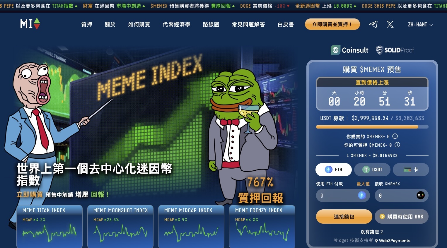 此外,為了保障投資者安全,Meme Index 已通過 Coinsult 和 SOLIDProof 智慧合約審計,進一步增強了市場信任度。目前,$MEMEX 預售正在火熱進行中,投資者可以通過官方網站參與,使用 $USDT、$ETH 或 $BNB 購買代幣。
