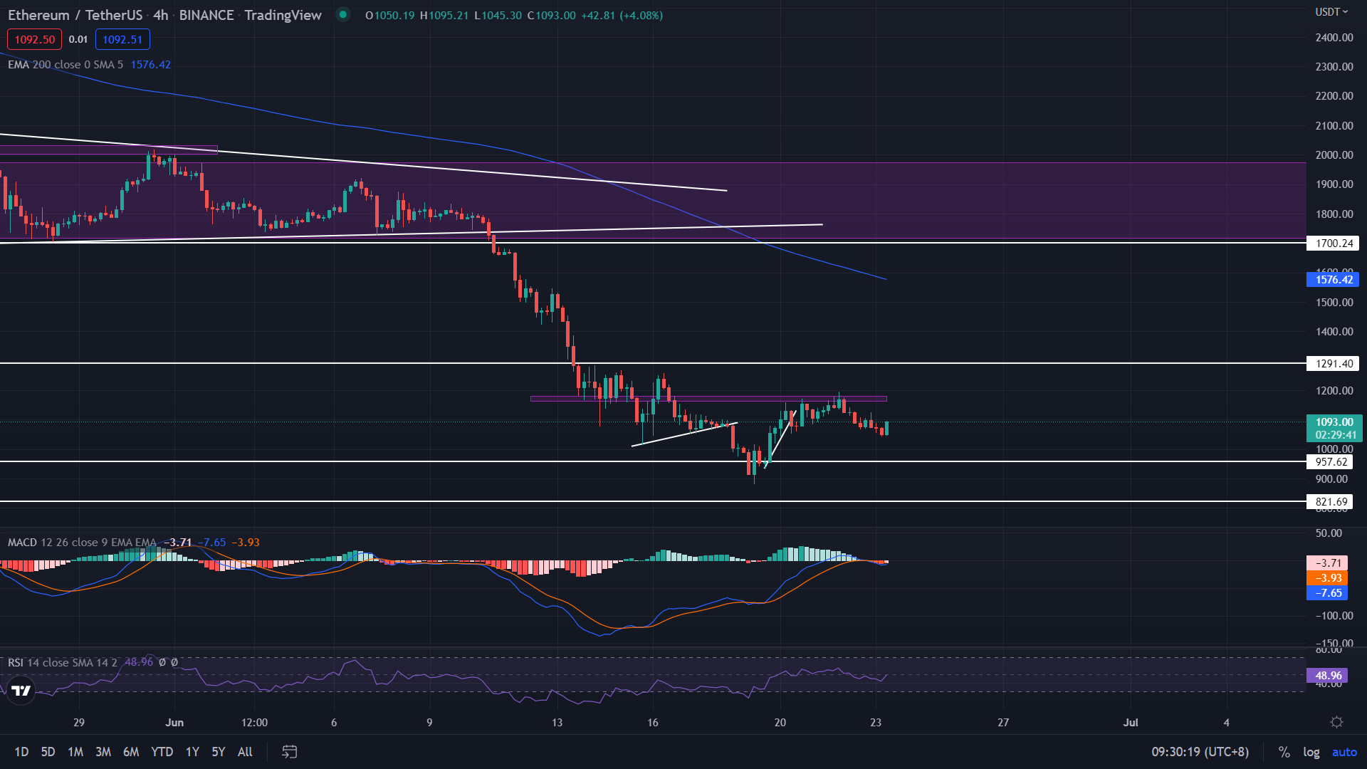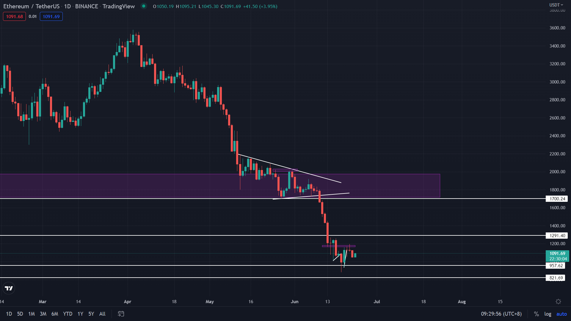 從天圖的角度來進行分析,乙太幣價格仍跟前幾日報告所寫的一樣會在此支撐位區間進行震蕩,也能看見下跌的力度逐漸減少,今天可能進行來回盤整且時間可能還需幾天來進行。 昨日乙太幣的最高價格1127,最低價格為1043以及收盤價為1050美元左右且跌幅 為6.72%。 今日的支撐位仍為957-821美元左右,阻力位為1560美元左右。