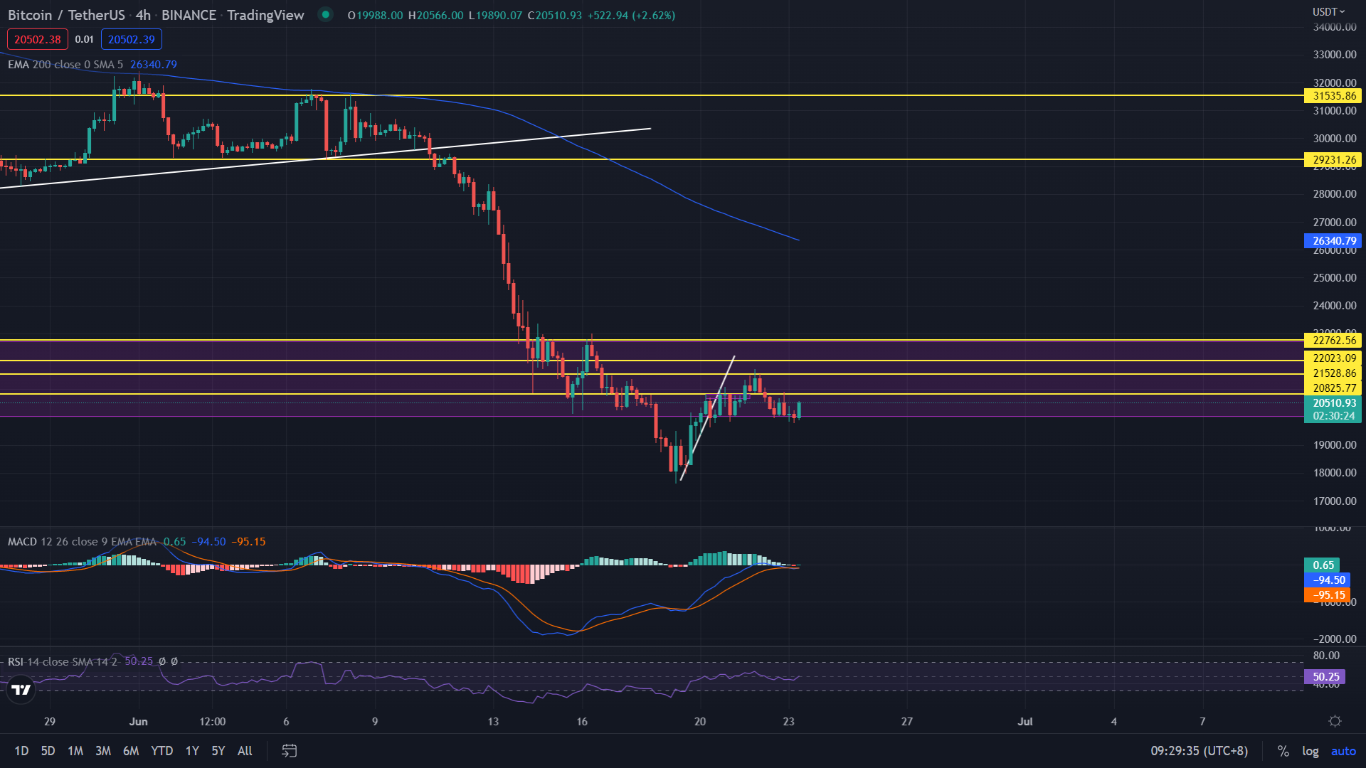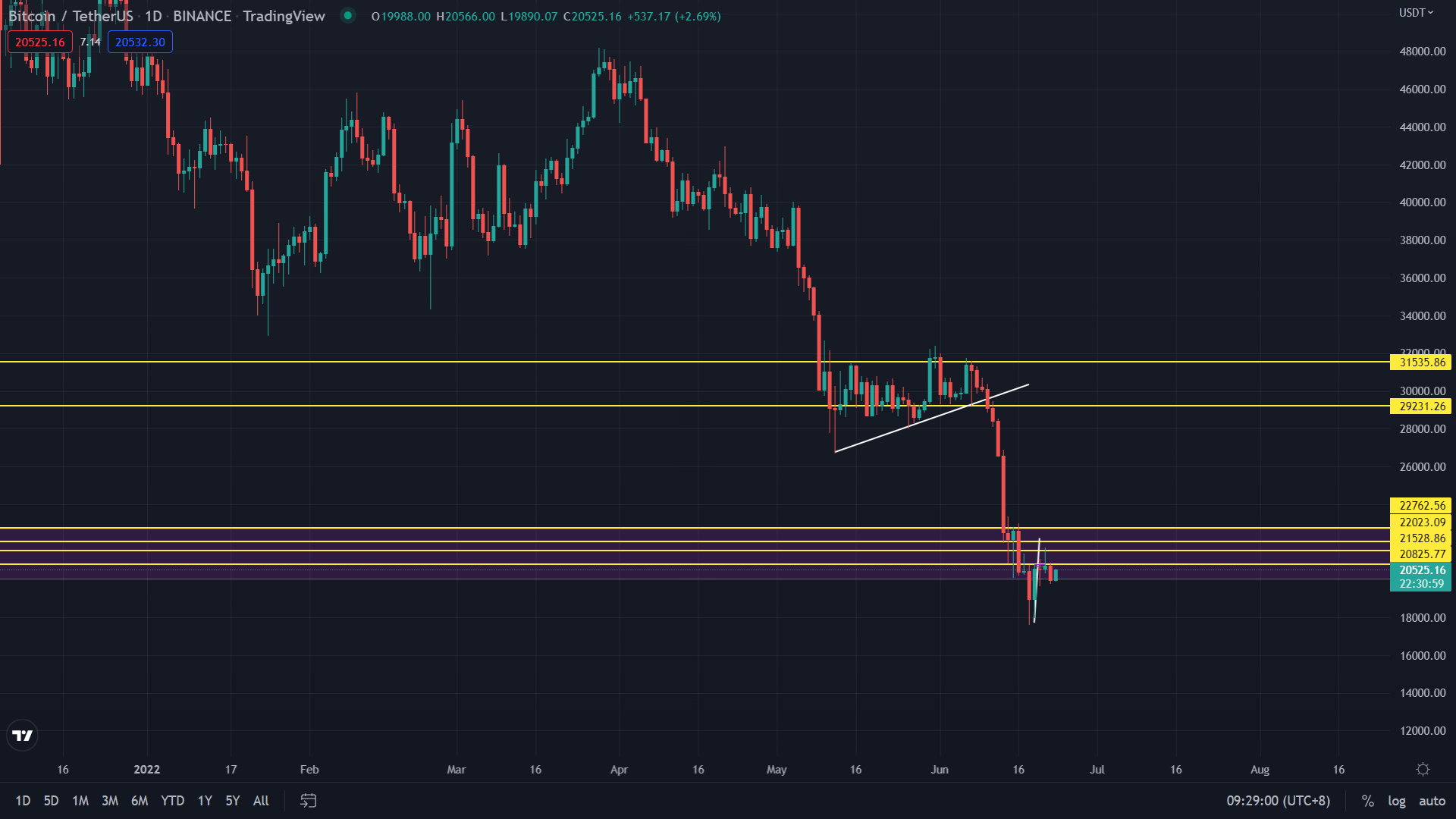 從天圖的角度來進行分析, 比特幣價格仍跟前幾日報告所寫的一樣會在此支撐位區間進行震蕩,也能看見下跌的力度逐漸減少,今天可能進行來回盤整且時間可能還需幾天來進行 。 昨日比特幣的最高價格20900,最低價格為19770以及收盤價為19987美元左右且跌幅為 3.55%。 今日的支撐位仍為18000-20000美元左右,阻力位為24515美元左右。