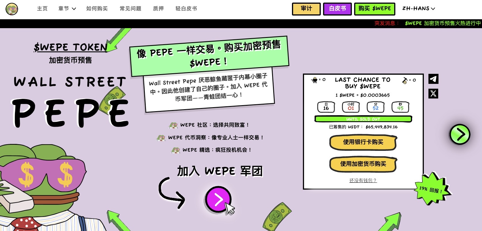 在另一邊,2025年迷因幣市場儘管因美聯儲利率決議短暫回調,投資者目光卻開始集中於新興項目Wall Street Pepe($WEPE)。作為一個創新迷因幣項目,$WEPE 在預售階段已籌集了6,500萬美元,離目標只剩幾百萬,相信數日內完成,成為年度最受矚目加密貨幣之一。該項目通過階段性預售策略吸引了大批小型投資者,目前預售價格為0.0003665美元,並隨著階段推進逐步上升。