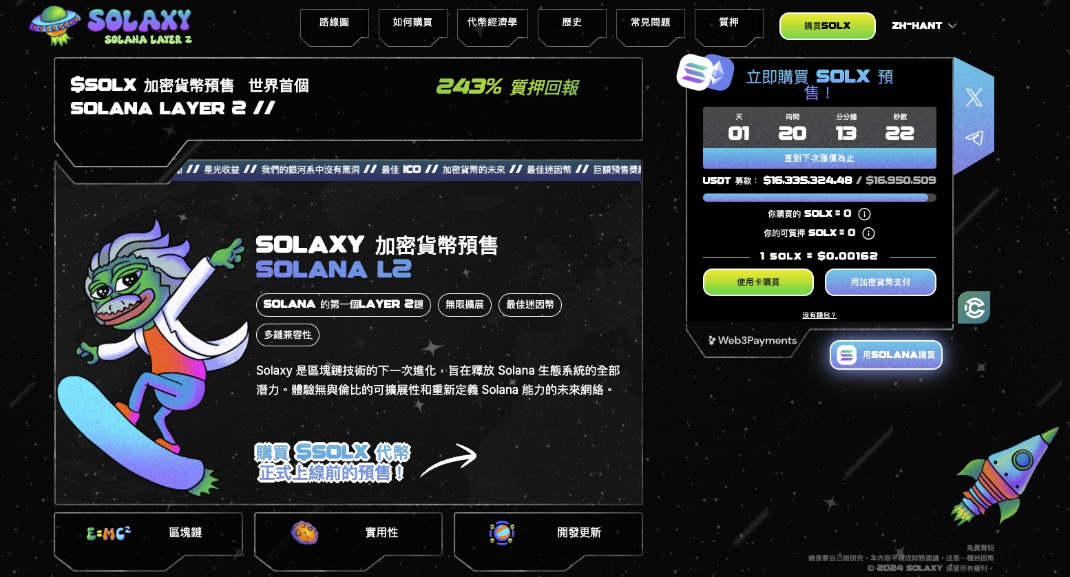 與此同時,Solaxy作為Solana區塊鏈首個Layer 2技術方案,在市場中掀起波瀾。該專案旨在解決Solana網路長期以來擴展性、擁堵和交易效率等問題。通過引入離鏈處理(off-chain processing)和交易打包(transaction bundling)技術,Solaxy顯著提升了網路性能,使交易速度更加迅捷,並在高流量時段避免了網路擁堵和停機問題。