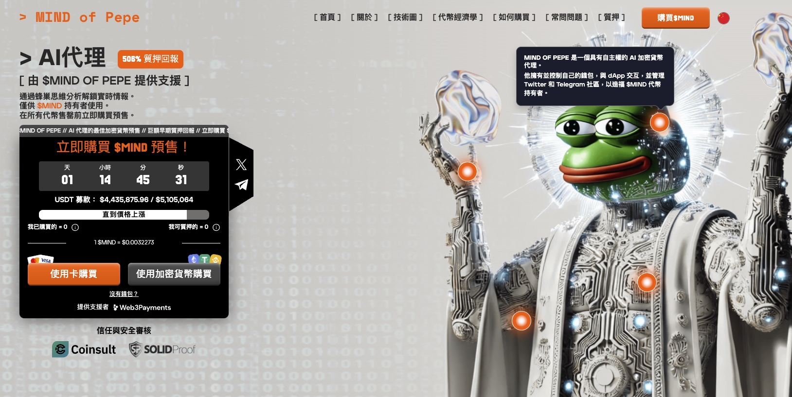 Mind of Pepe ($MIND) 借助 $PEPE 成功(市值高達 72.5 億美元),為代幣持有者提供獨家AI生成交易洞察。該專案引入了自主AI代理——一種能夠在最小人為幹預下獨立運作人工智慧系統,以實現高效資料分析和交易指引。