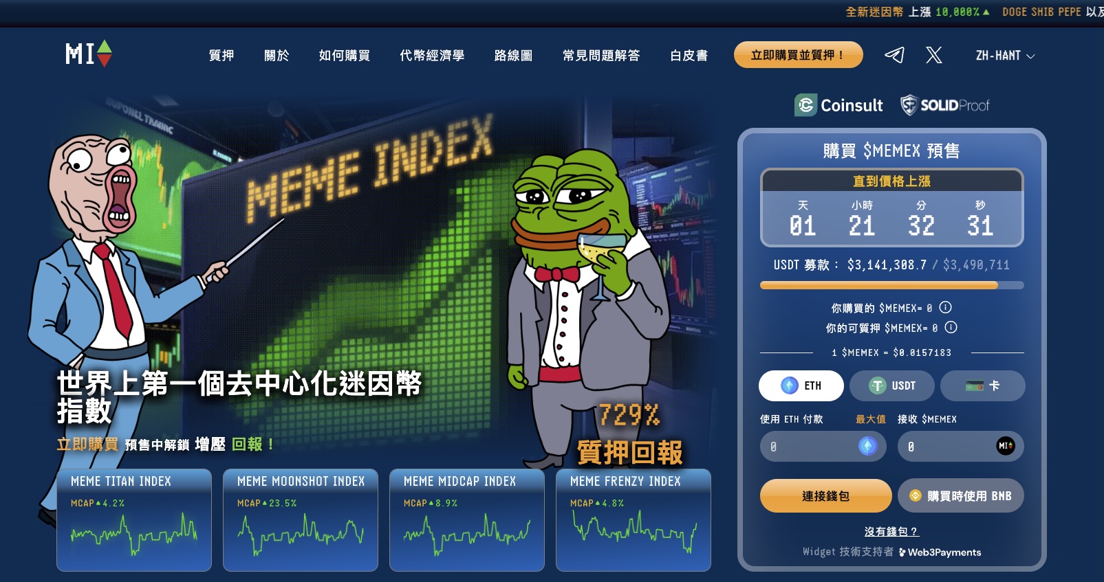 此外,為了保障投資者安全,Meme Index 已通過 Coinsult 和 SOLIDProof 智慧合約審計,進一步增強了市場信任度。目前,$MEMEX 預售正在火熱進行中,投資者可以通過官方網站參與,使用 $USDT、$ETH 或 $BNB 購買代幣。