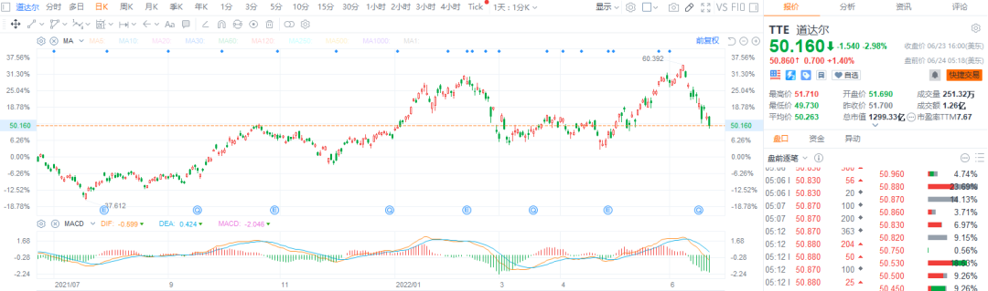 截止6月24日,道達爾已從高位的60元下跌至50.16元,道達爾今年一年漲幅僅剩4.22%。