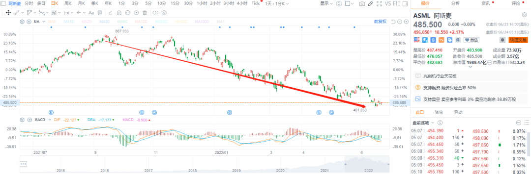 截止6月24日,ASML在美股市場今年以來下跌接近40%,也跌破近一年半以來的低點,目前485.5元/股。