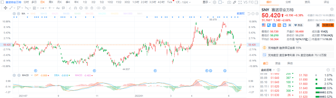 再看到做醫藥的賽諾菲公司,進入2022年後,股價在48元至56元區間震盪。截止6月24日,股價為50.42元,今年賽諾菲的漲幅為4.83%。