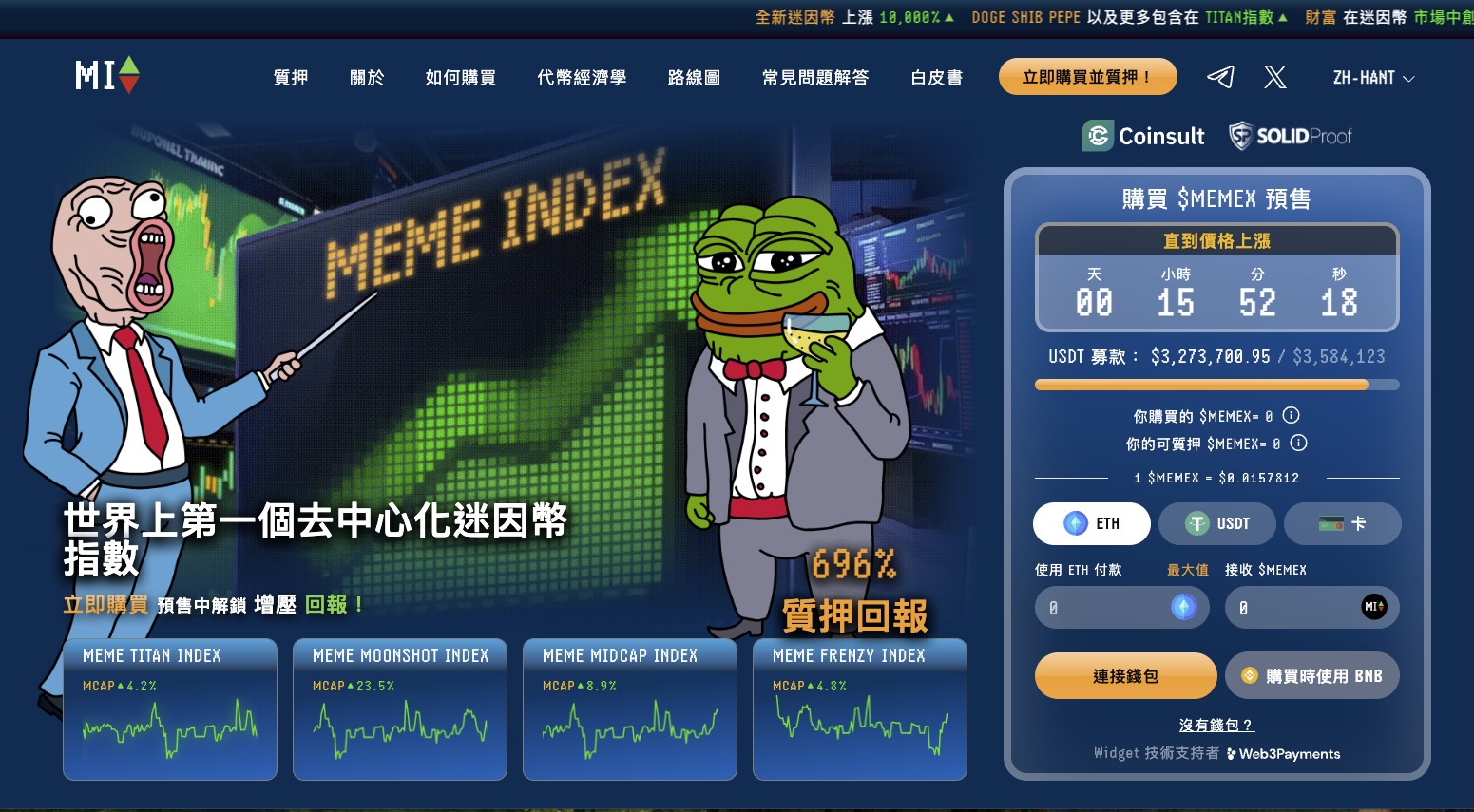 此外,為了保障投資者安全,Meme Index 已通過 Coinsult 和 SOLIDProof 智慧合約審計,進一步增強了市場信任度。目前,$MEMEX 預售正在火熱進行中,投資者可以通過官方網站參與,使用 $USDT、$ETH 或 $BNB 購買代幣。