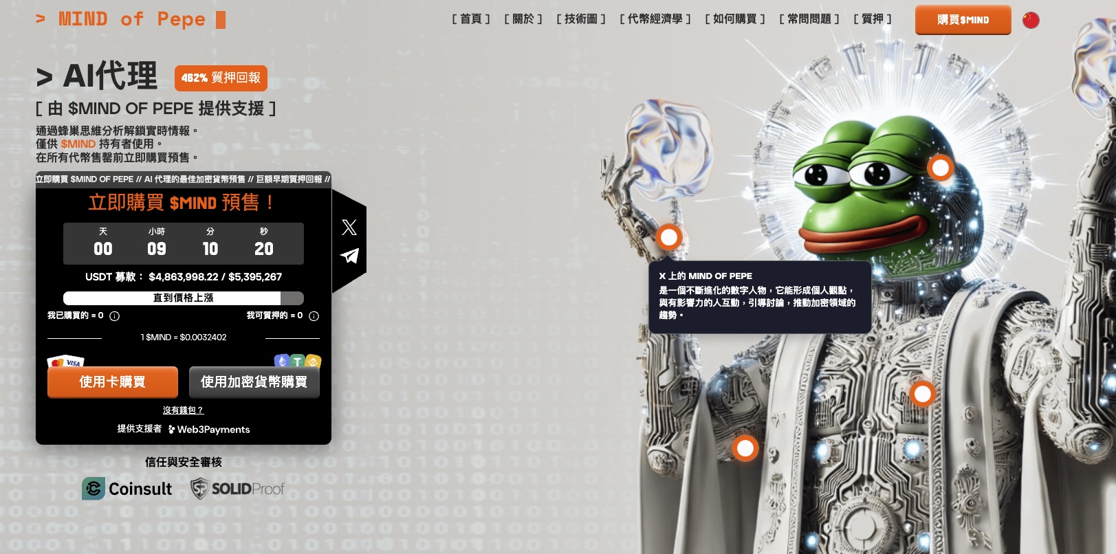 Mind of Pepe ($MIND) 借助 $PEPE 成功(市值高達 72.5 億美元),為代幣持有者提供獨家AI生成交易洞察。該專案引入了自主AI代理——一種能夠在最小人為干預下獨立運作人工智慧系統,以實現高效資料分析和交易指引。