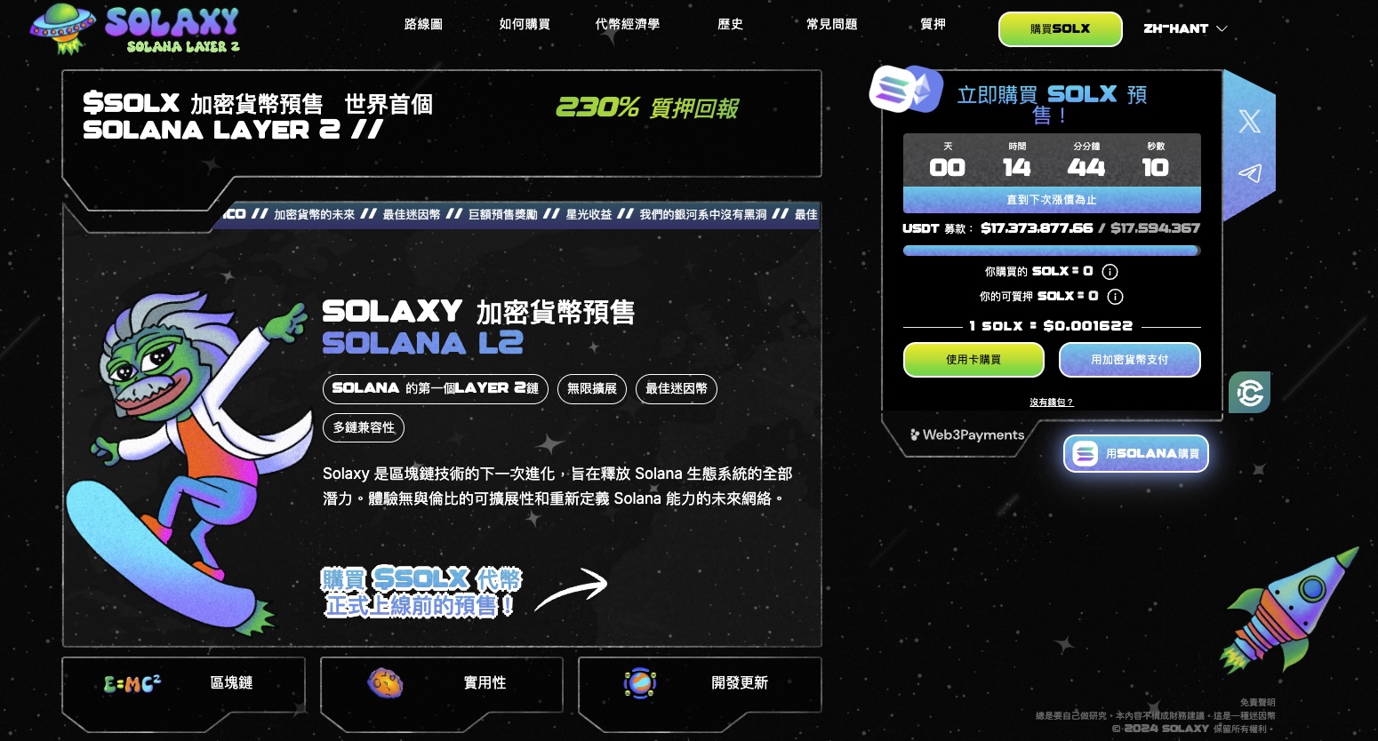 與$PEPU熱潮相呼應,Solaxy ($SOLX) 作為Solana首個Layer 2協議,也在市場掀起了新浪潮。Solaxy旨在解決Solana面臨網路擁堵、交易失敗及可擴展性不足等問題,並憑藉其創新技術,迅速籌集近1,800萬美元預售資金。