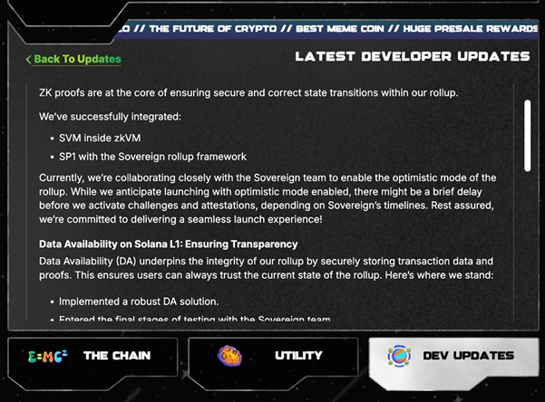 根據 Solaxy 開發團隊 1 月20 日發布的最新技術更新,項目正在快速推進 ZK Proofs + Optimistic Rollup 方案,這將確保交易批量打包後 高效回寫至主網,實現更強的可擴展性。