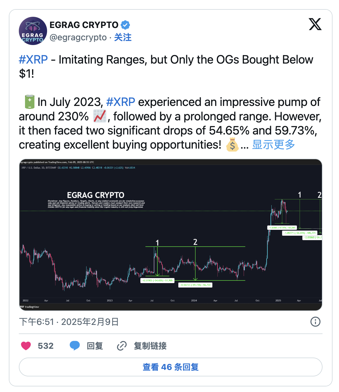 2023 年 7 月,XRP 曾飆升 230%,但在此之前經歷了兩次大幅回撤,分別為 54.65% 和 59.73%。