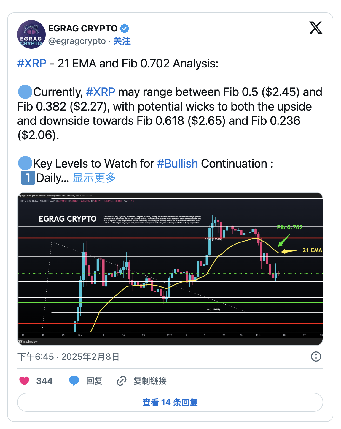 目前,XRP 盤整在斐波那契 0.5 位置($2.45)與 0.382 位置($2.27)之間,處於橫盤整理階段。若能突破 21 日均線($2.70),可能會迎來動能恢復。但真正的考驗在斐波那契 0.702 位置($2.80),一旦成功突破該水平,將確認多頭重新掌控市場。