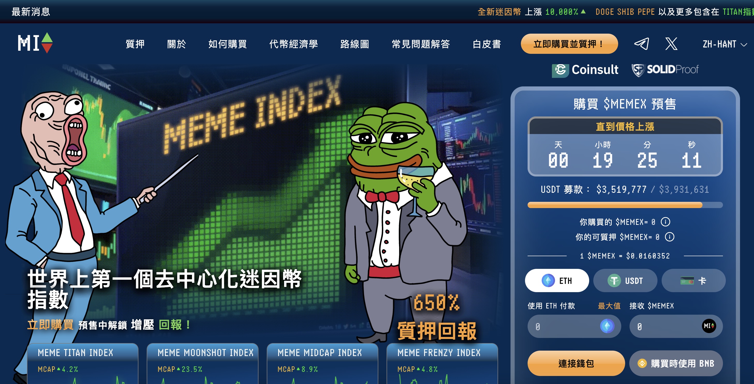 此外,為了保障投資者安全,Meme Index 已通過 Coinsult 和 SOLIDProof 智慧合約審計,進一步增強了市場信任度。目前,$MEMEX 預售正在火熱進行中,投資者可以通過官方網站參與,使用 $USDT、$ETH 或 $BNB 購買代幣。