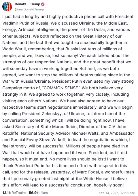 美國總統特朗普證實,周三(2月12日)與俄羅斯總統普京進行了漫長且富有成效的電話交談,兩國領導人都已發出訪問對方國家的邀請。随後,他立即致電烏克蘭總統澤倫斯基告知細節。他強調結束烏克蘭戰争的談判将「立即」啓動,并對其顧問明確表示,他希望迅速結束烏克蘭沖突。