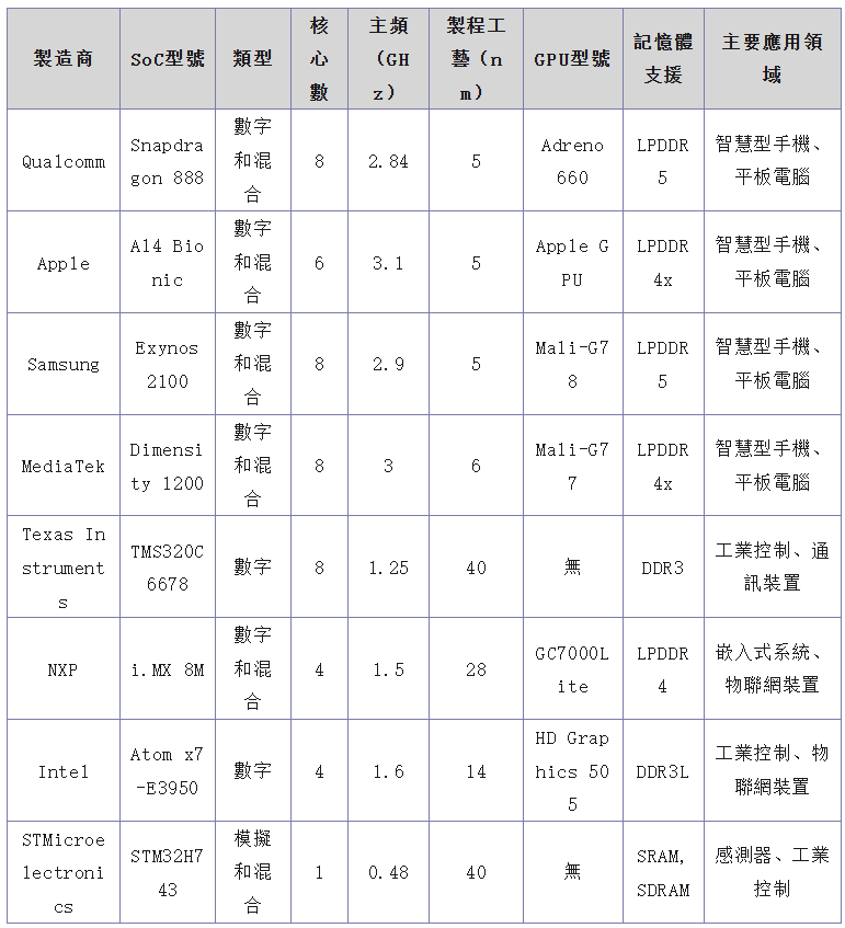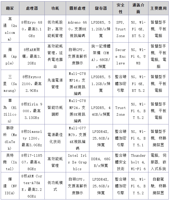 下表詳細對比了一些主要SoC廠家的具體性能指標,包括處理器核心數和頻率、功耗、圖形處理能力、儲存器類型和頻寬、安全性功能、通訊介面等。