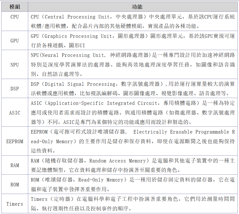 儘管每個SoC晶片的具體模組組態可能因應用需求而異,但左側列出的模組,如微處理器、匯流排、SRAM、NVM和外設介面控制電路,幾乎在所有SoC設計中都是標準組態。這些模組構成了SoC的基礎架構,確保了其基本功能的實現。隨著技術的發展,SoC設計將繼續向著更高的整合度、更低的功耗和更強的性能方向發展,以滿足不斷增長的市場需求。