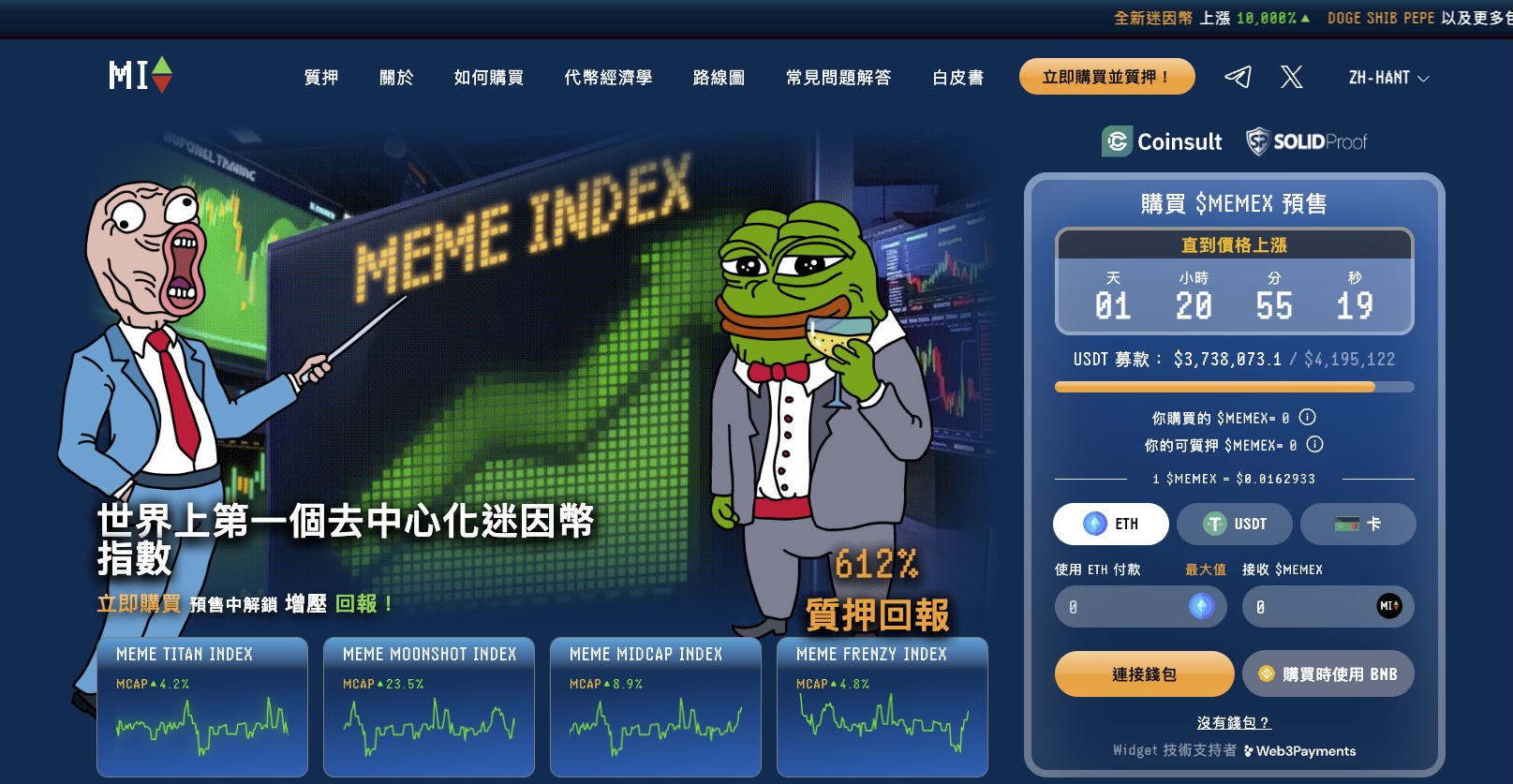 項目目前已售出380萬美元,目前價格為$0.0162933,並隨每個階段上漲。此外為了確保投資者安全,Meme Index 已通過 Coinsult 和 SOLIDProof 智慧合約審計,進一步增強了市場信任。目前,$MEMEX 預售正在火熱進行中,投資者可以透過官方網站參與,使用 $USDT、$ETH 或 $BNB 購買代幣。