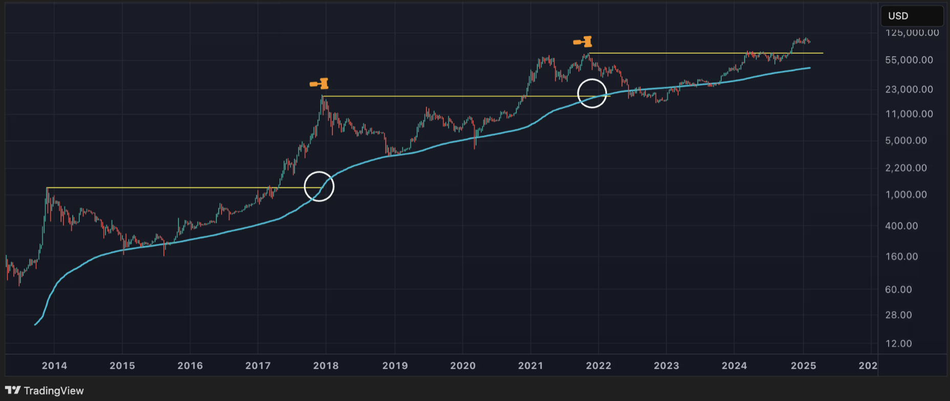 根據歷史數據,牛市通常在 SMA 突破前一輪牛市高點時才會結束,而 2021 年的高點為 69,000 美元。這表明比特幣仍有上漲空間,支持它很快突破 110,000 美元的預測。
