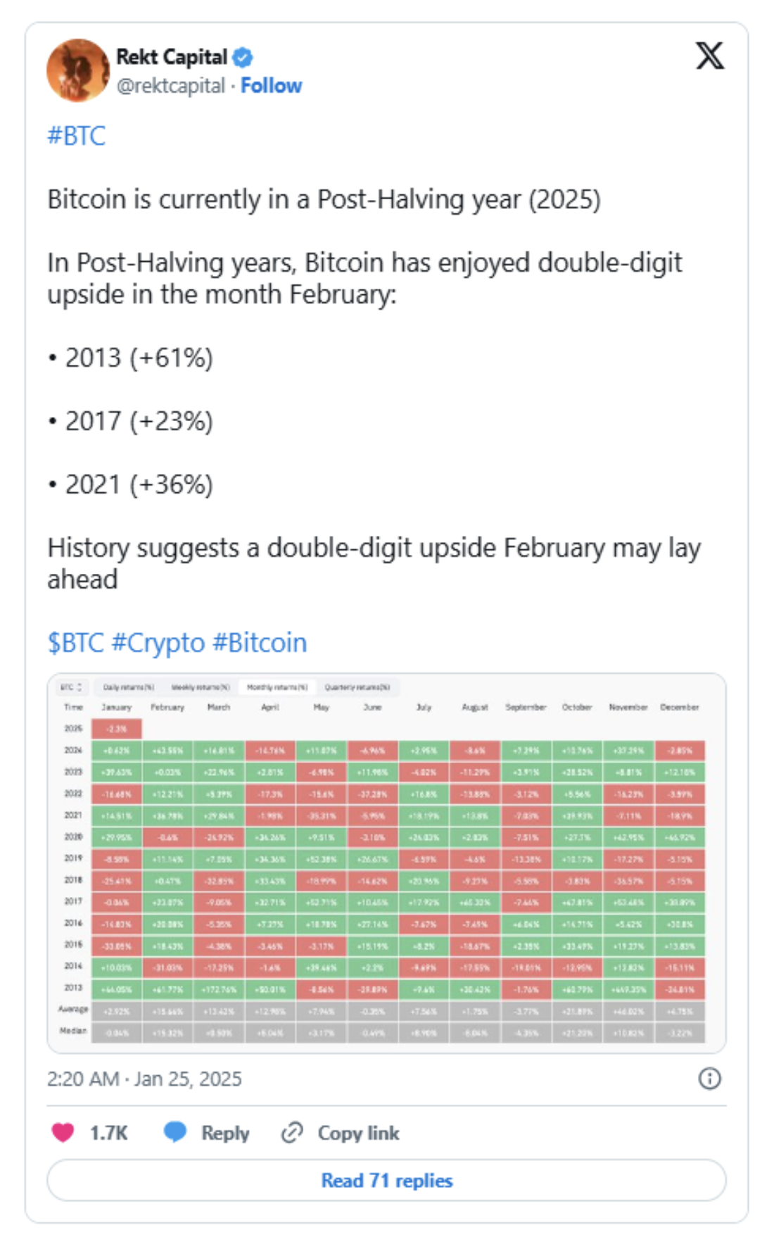 這一價格目標符合 200 週移動平均線的趨勢,並且 2025 年是比特幣減半之後的一年,歷史上這段時間通常比減半年本身更為強勁。加密分析師 Rekt Capital 也認為,比特幣仍處於牛市周期內。值得注意的是,比特幣今年迄今(YTD)已上漲 2.55%,而去年漲幅則高達 125%。
