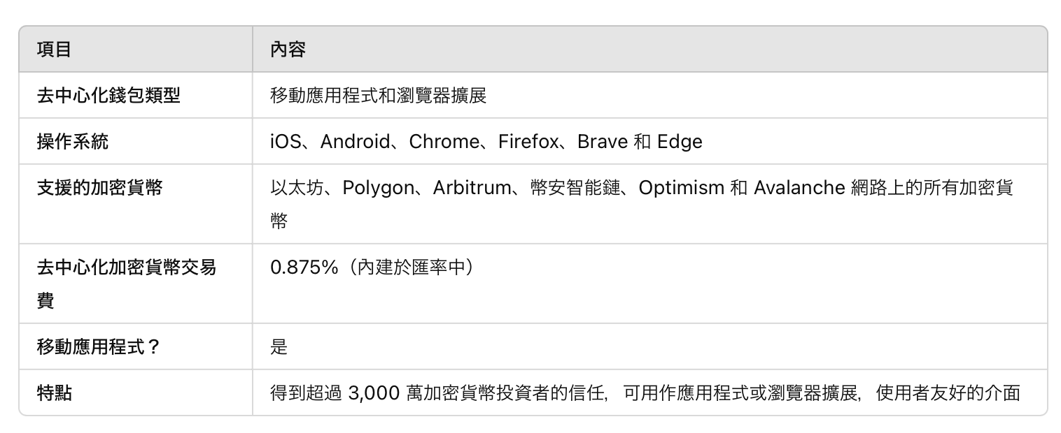MetaMask是用於儲存以太坊和其他 ERC-20 代幣的最佳 DeFi 加密錢包之一。 MetaMask 已有 3,000 萬用戶,可免費下載。用戶可以選擇 iOS 和 Android 的行動應用程序,或是 Chrome、Edge、Brave 和 Firefox 的網頁瀏覽器擴充功能。