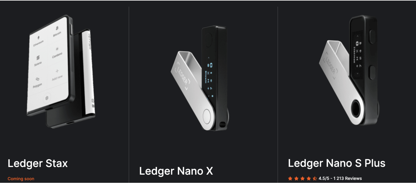 要使用Ledger錢包,您需要選擇Ledger Nano X、Ledger Nano S Plus或Ledger Stax。 Nano X特別有趣,因為它不僅具有USB功能,還可以透過藍牙連接到裝置。這意味著您可以在智慧型手機上安全執行交易,而無需透過電纜連接Ledger錢包。