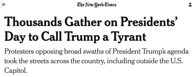 周一(2月17日)總統日,全美各地爆發了反對總統的抗議遊行活動。在紐約,成千上萬人湧上街頭,從聯合廣場出發,一直走向華盛頓廣場公園。這次,總統和馬斯克都是人們抗議的對象。