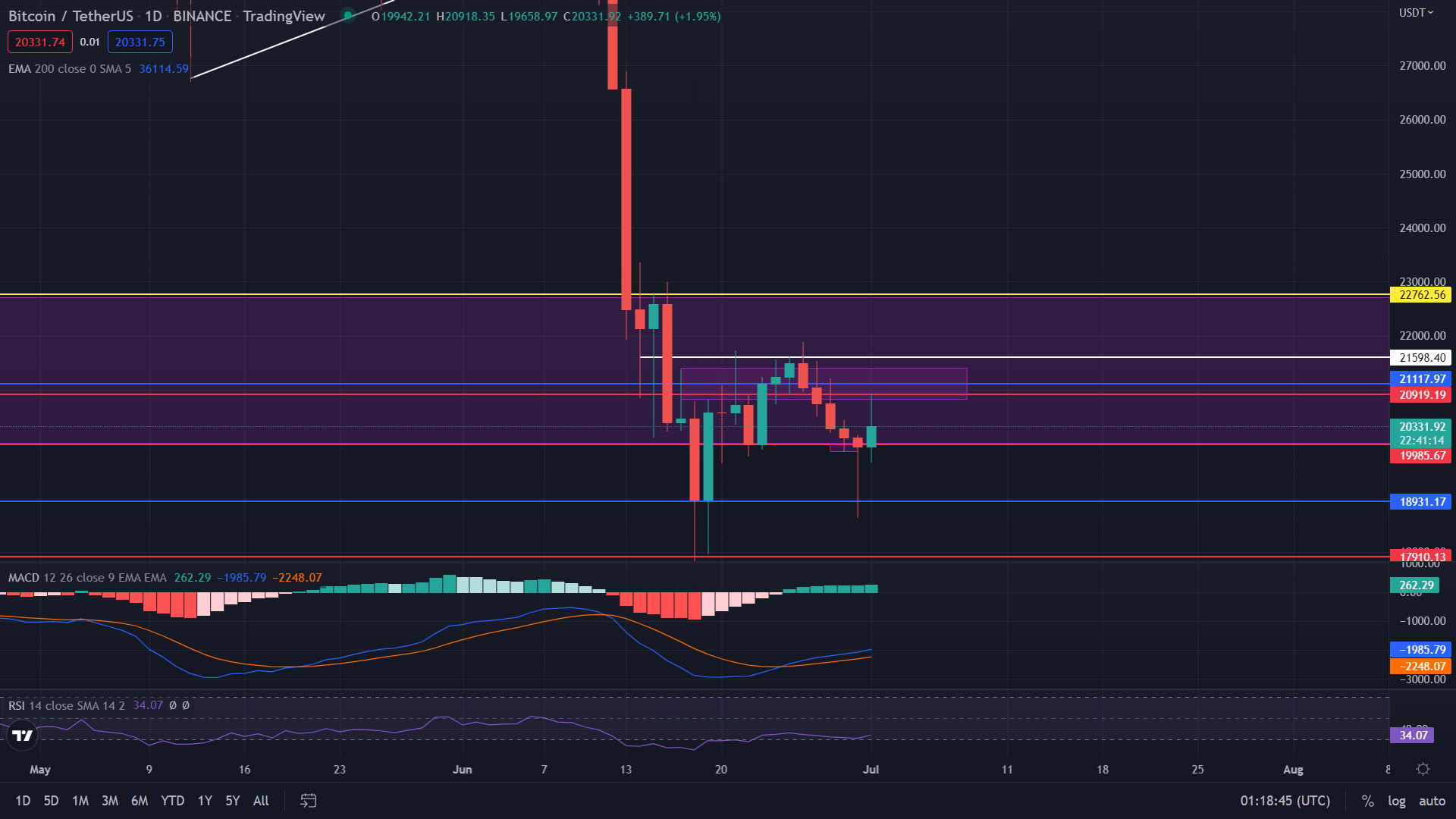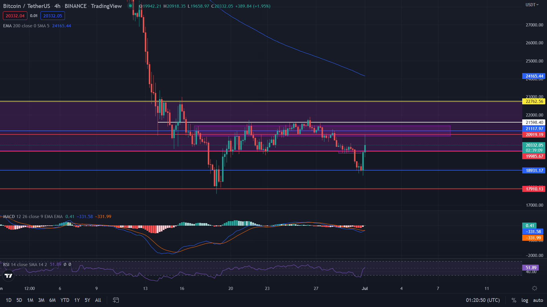從4小時圖來進行分析,今天的比特幣賣空量能逐漸減少且下跌無量並由紅色量柱轉為青色量柱,出現了上漲的跡象。 此外,根據指標分析,雖然通過MACD出現了黃金交叉但低於 0軸, 而RSI高於50, 並且在EMA 200 的下方。 此分析可以確定市場更傾向於較弱的熊市市場。 但也極有可能進行回調至22800美元左右,所以做空單的交易者也需謹慎。