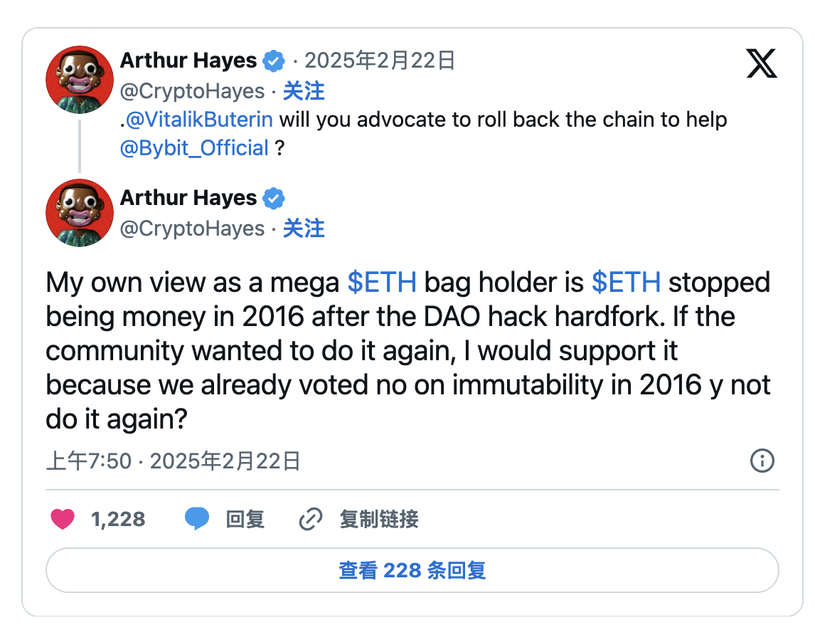 Bybit 駭客事件後,加密社群在如何應對上出現嚴重分歧。 BitMEX 聯合創始人 Arthur Hayes 呼籲回滾以太坊區塊鏈,並引用 2016 年 DAO 駭客事件 作為先例。他表示:“如果社區願意再次執行回滾,我支持,因為我們在 2016 年已經否決了區塊鏈不可變性的理念。”