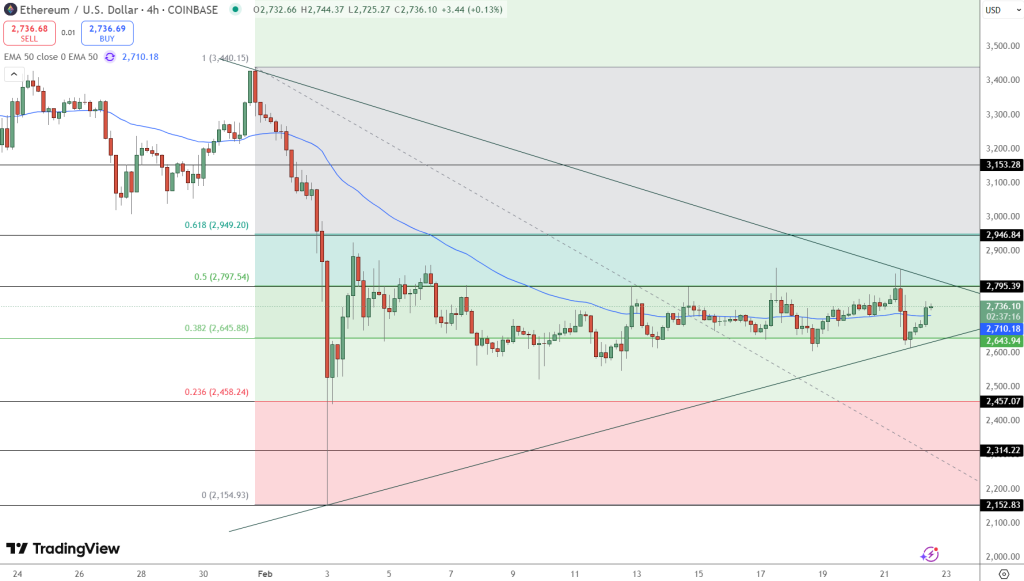 以太坊目前報價 $2,735,24 小時交易量 $33.06 億。先前 ETH 一度跌至 $2,625,隨後反彈並企穩 $2,710 支撐位,該位置與 50 日 EMA 重合。