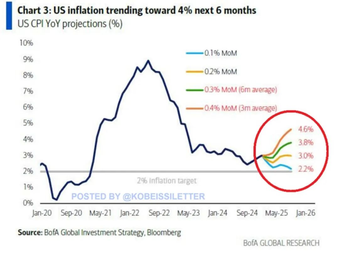 美國銀行報告:未來 6 個月美國 CPI 有望達到 4.6%過去 3 個月,CPI 通脹率環比平均上漲 0.4%。如果這一趨勢持續下去,到 7 月,同比通脹率將達到 4.6%,創 2023 年 4 月以來的最高水平,這將是美聯儲 2% 通脹目標的兩倍多即使月度通脹率降至 0.3%,同比通脹率仍將升至 3.8% (機構調研記)