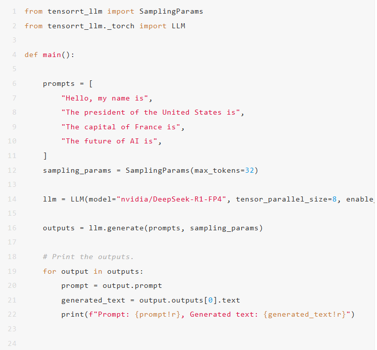 要使用TensorRT-LLM LLM API部署量化後的FP4權重檔案,並為給定的提示生成文字響應,請參照以下示例程式碼: