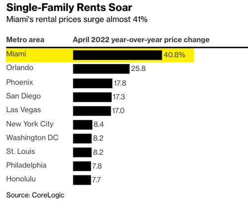 在邁阿密,4月份單戶的租金同比漲幅甚至超過40%。排在第二位的奧蘭多,租金漲幅也達到25%。