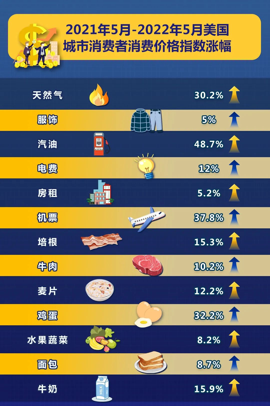 而牛肉、雞蛋、牛奶、麵包這些生活必需品,漲幅都在10%以上。