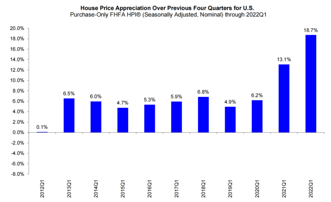 一季度,全美房價平均上漲18.7%,與歷年一季度相比,已經創下新高。