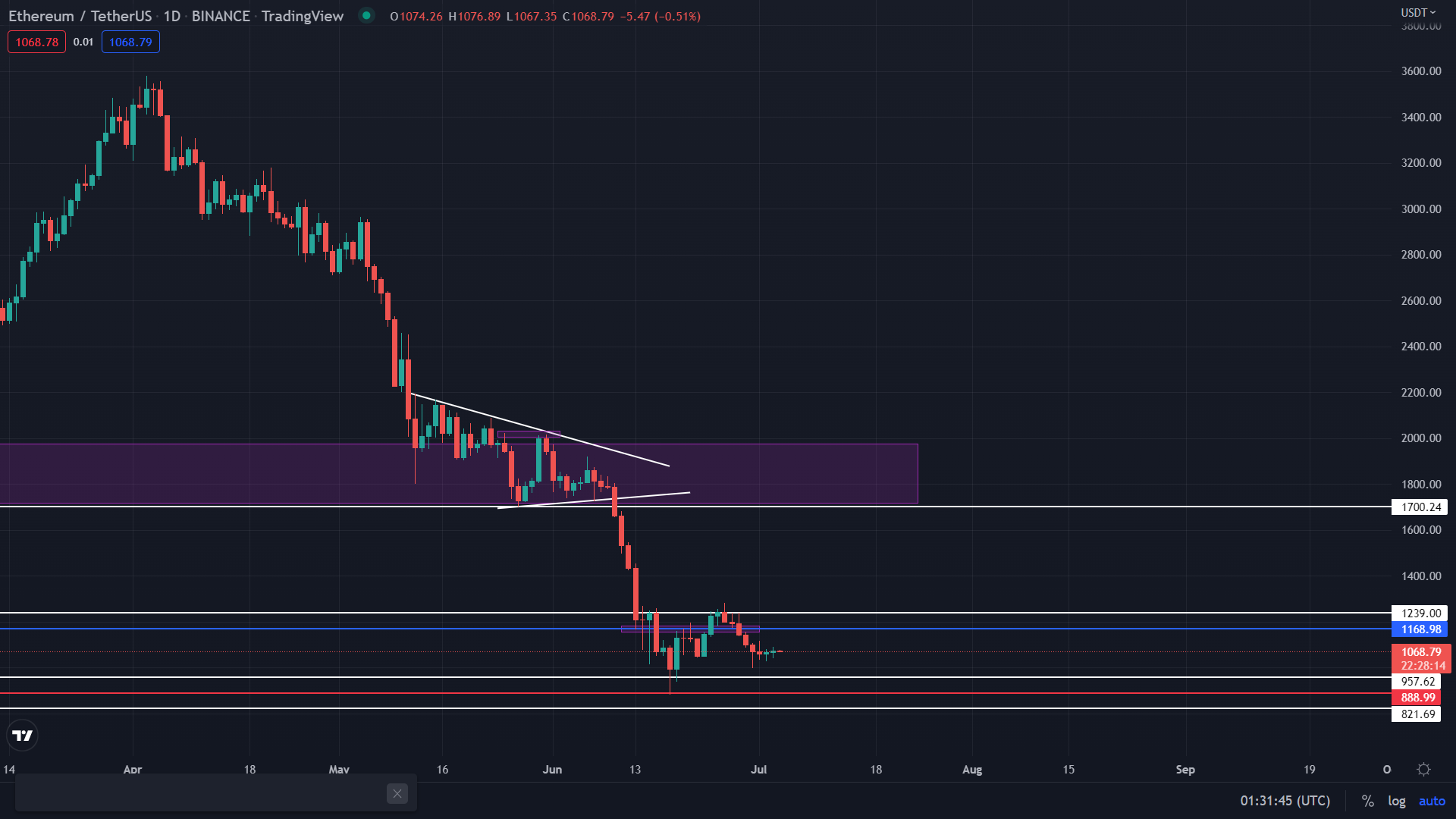 從天圖的角度來進行分析,比特幣價格在經過了週末的走勢后仍在支撐位進行震蕩並沒有太大的浮動,並且回測到藍線支撐位並直接反彈至上方阻力位,今日的價格將會以上漲為主,昨日乙太幣的最高價格為1088 ,最低價格為1040以及收盤價為1074美元左右且漲幅為0.68% 。 今日的支撐位仍為957-821美元左右,阻力位為1290美元左右。