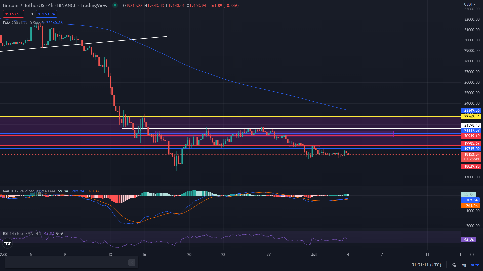 從4小時圖來進行分析,今天的比特幣賣空量能逐漸減少且下跌無量並由紅色量柱轉為青色量柱,出現了上漲的跡象。 此外,根據指標分析,雖然通過MACD出現了黃金交叉但低於 0軸, 而RSI高於50, 並且在EMA 200 的下方。 此分析可以確定市場更傾向於較弱的熊市市場。 但也極有可能進行回調至22800美元左右,所以做空單的交易者也需謹慎。