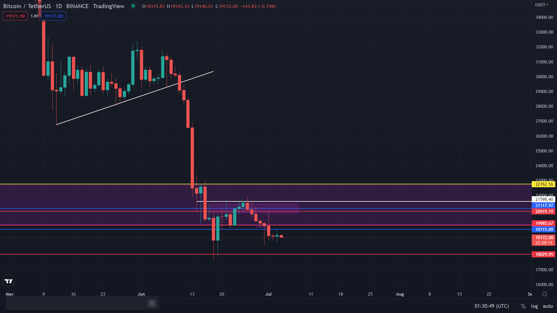 從天圖的角度來進行分析, 比特幣價格在經過了週末的走勢后仍在支撐位進行震蕩並沒有太大的浮動,並且回測到藍線支撐位並直接反彈至上方阻力位,今日的價格將會以上漲為主要浮動 。 昨日比特幣的最高價格19647,最低價格為18781以及收盤價為19315美元左右且漲幅 為0.33%。 今日的支撐位仍為18000-20000美元左右可以選擇做多,阻力位為24515美元左右。