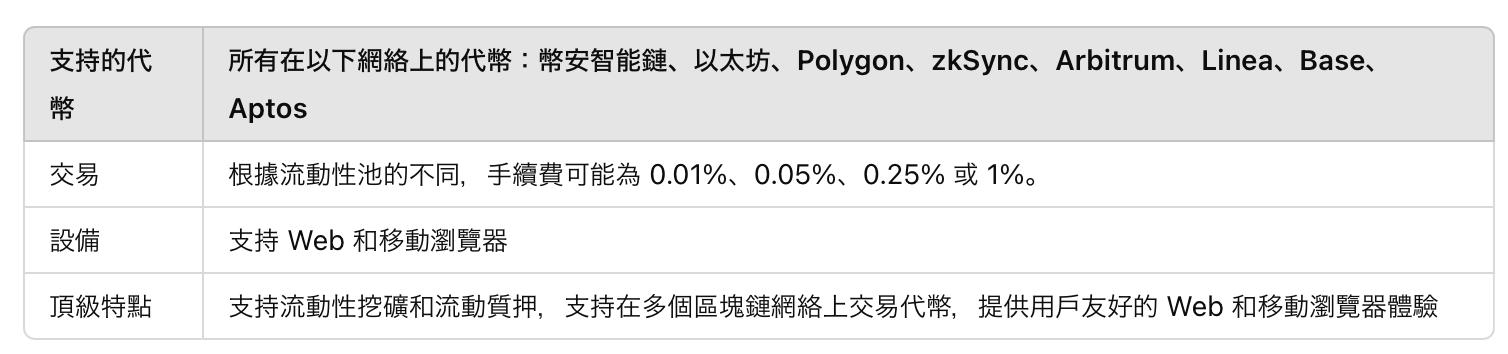 如果您想在幣安智能鏈上交易代幣,PancakeSwap是最好的無KYC加密貨幣交易所。該平台列出了數千種BSC代幣,通常是新項目的首選地。不過,PancakeSwap 也支援跨鏈功能。它支援的一些網路包括以太坊、Polygon、Base 和 Arbitrum。