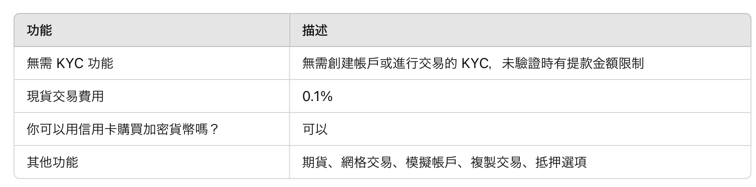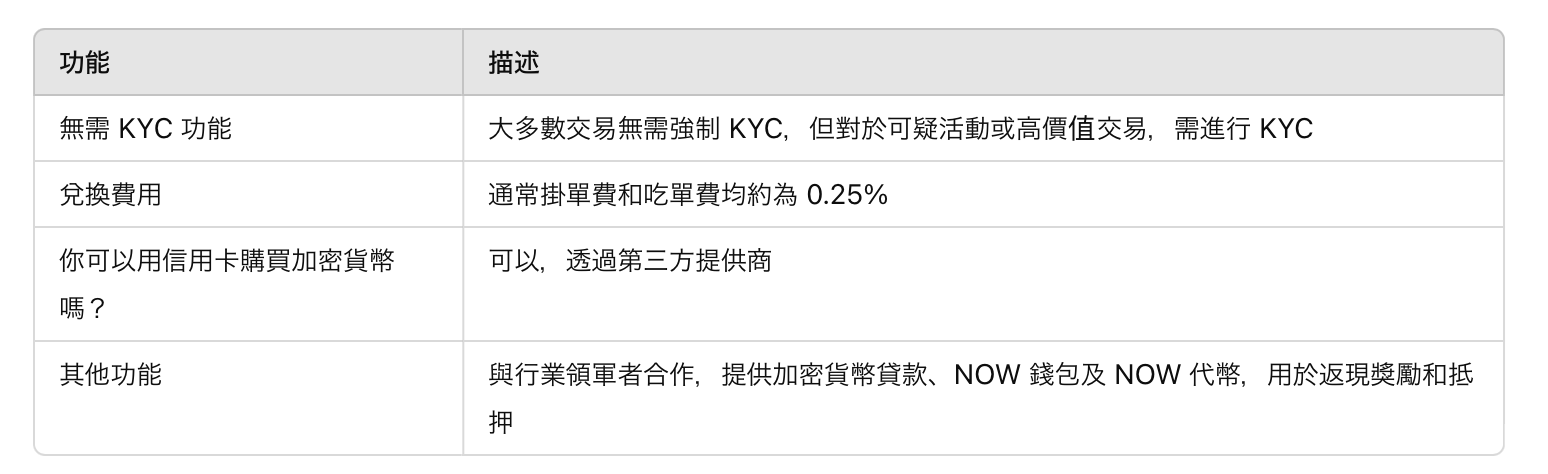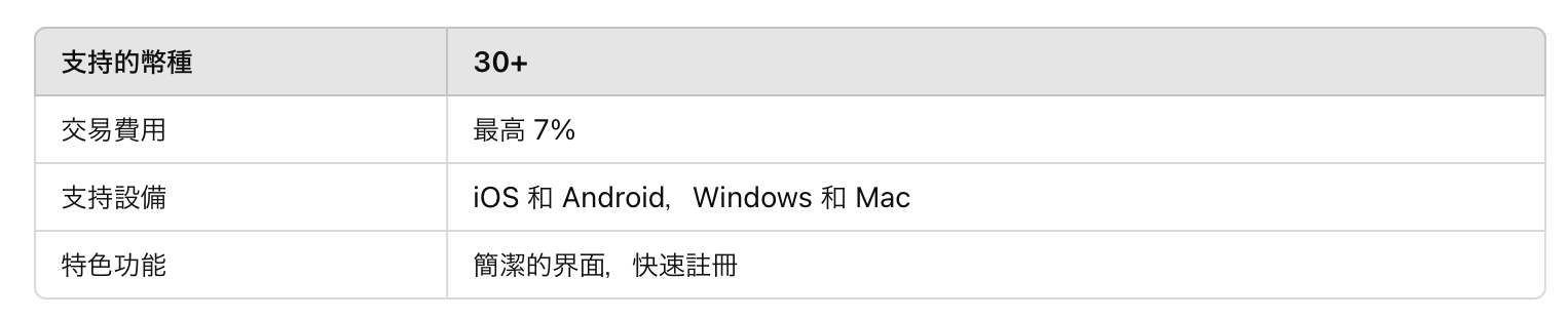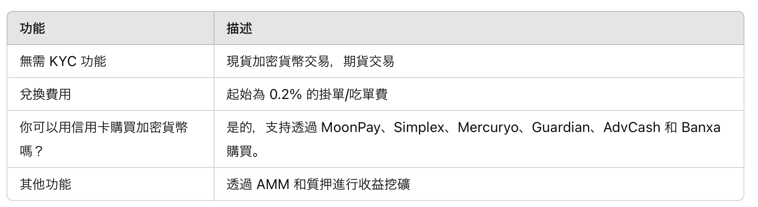 該交易所具備現代加密貨幣交易所應有的基礎功能,包括內建的加密錢包、教育資源和多種付款選項,讓加密貨幣購買變得簡單又快速。