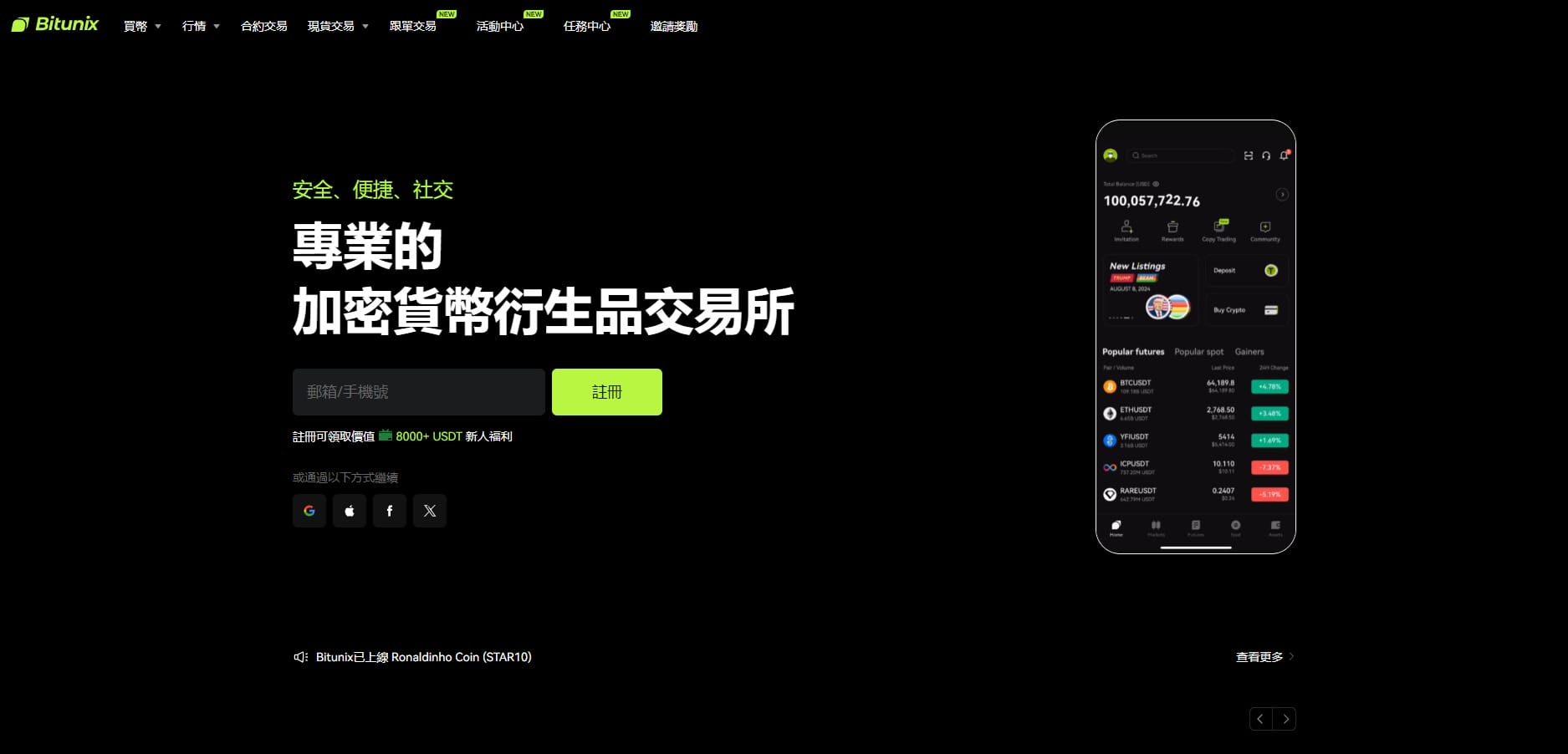 Bitunix 總部位於香港,是一家領先的無KYC加密交易所,以其強大的交易功能、深厚的流動性和卓越的提現限額而聞名。平台支援超過500種交易對和期貨合約,槓桿高達100倍。