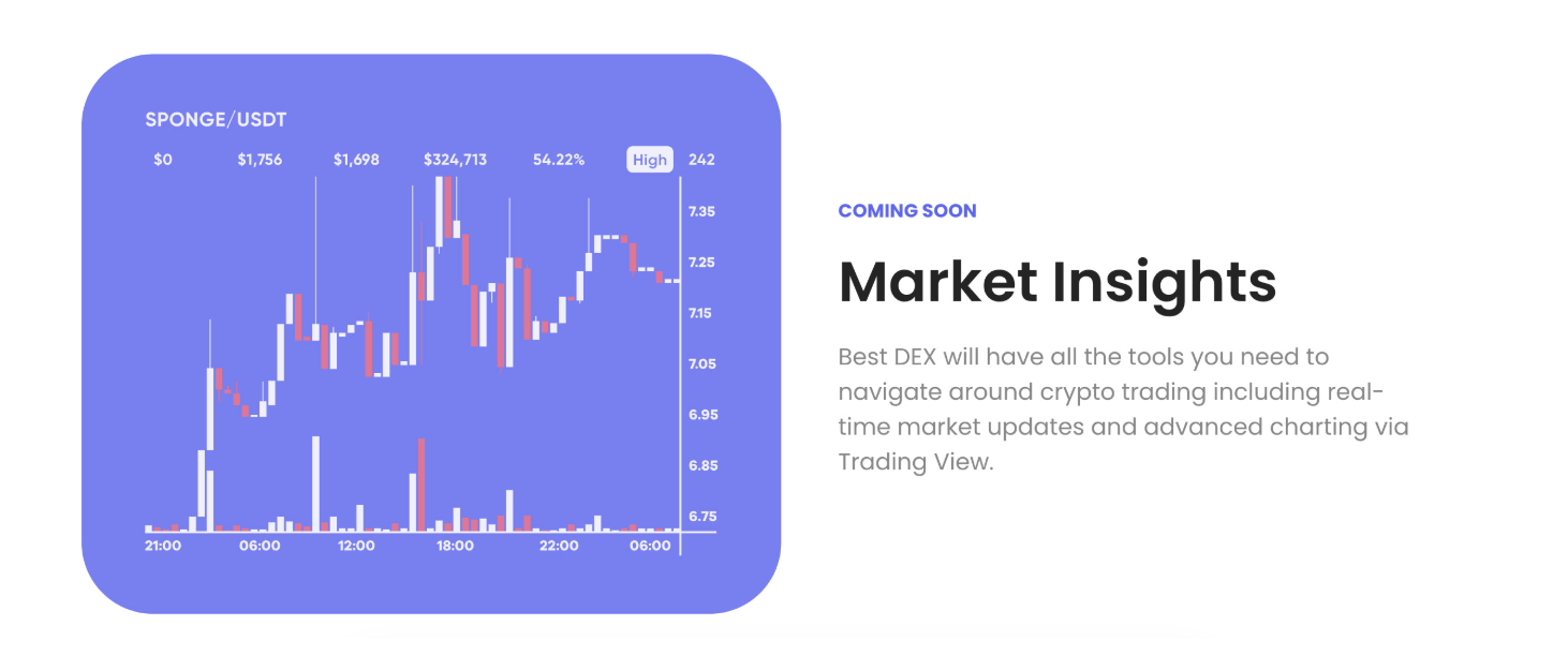 我們也喜歡Best DEX不收取佣金。儘管您仍然需要支付交易費用,但這是由完成交換的流動性池決定的。 Best DEX也將很快推出許多其他功能。這包括完善的市場分析 – 讓您評估最佳要購買的加密貨幣 – 以及哪些要避免購買。
